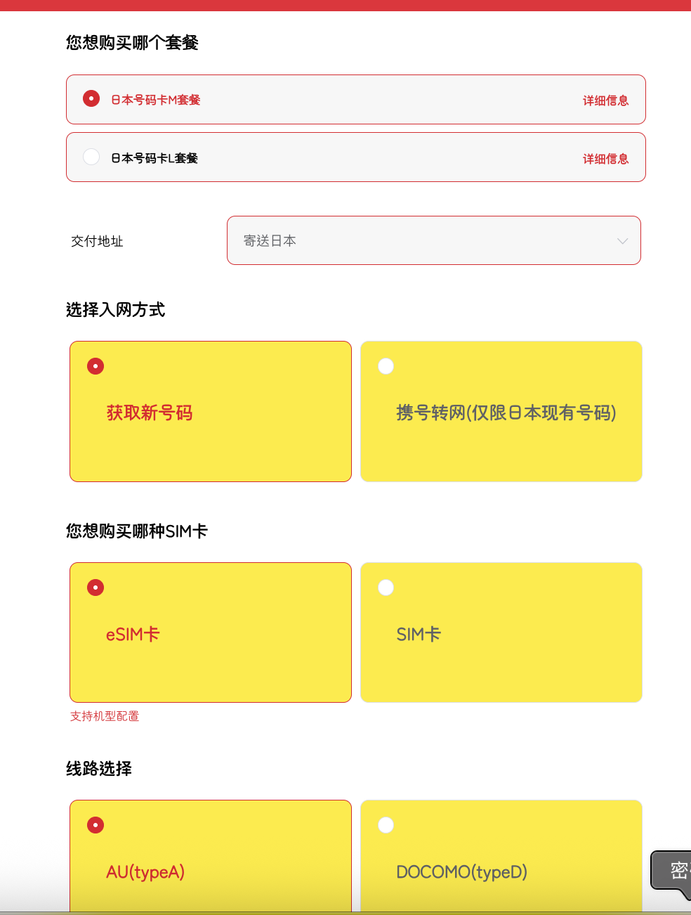 - 选择eSIM卡(比较方便快捷,嘿嘿),邮寄实体太慢了。