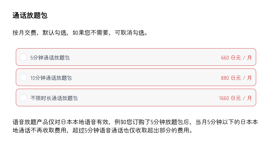 - 可以点击取消掉”通话放题包“,这个只能在日本本地使用,漫游的时候是不生效的。