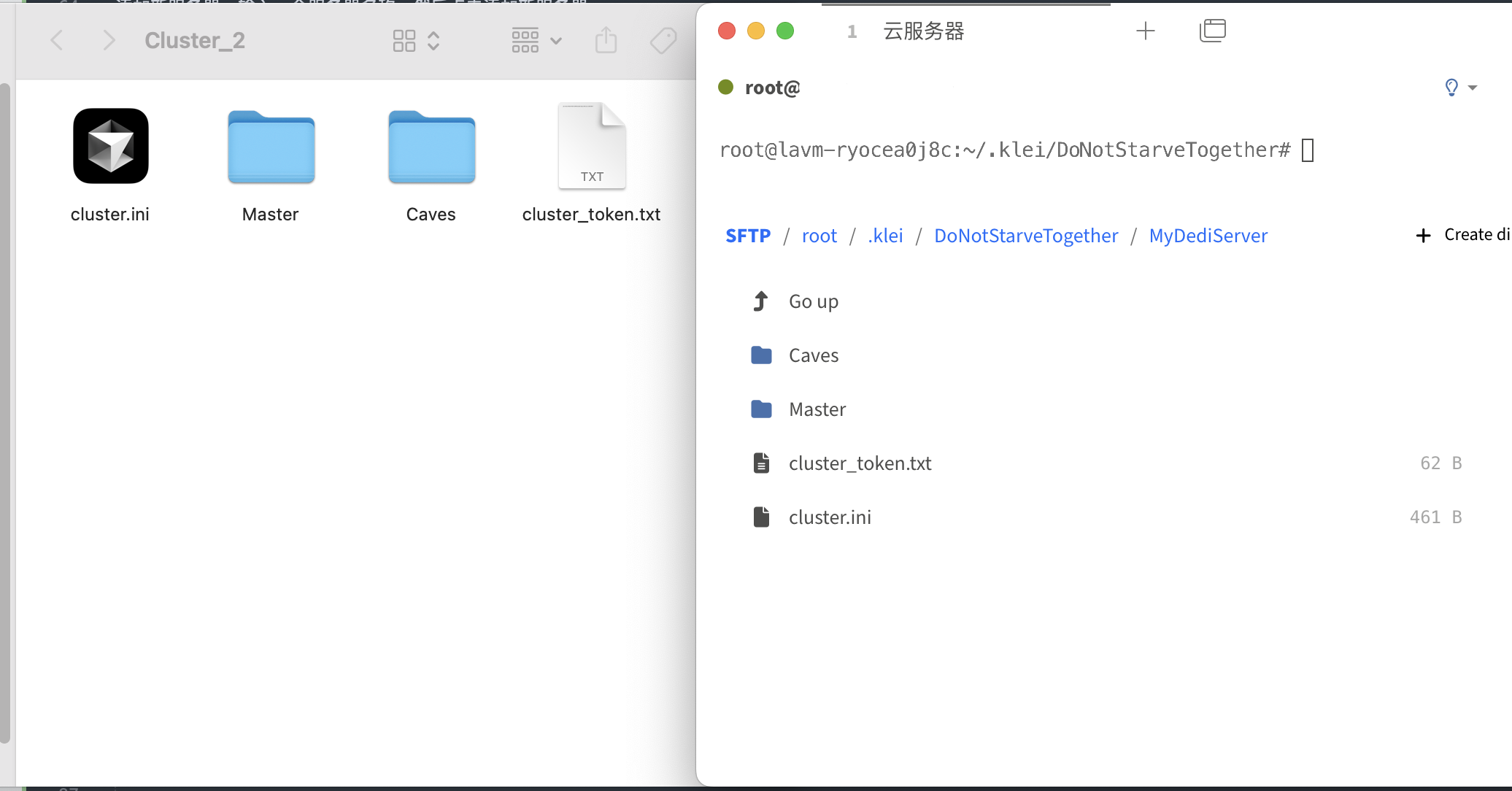 使用SFTP工具(我这里使用的是Tabby自带的SFTP上传工具),将Master Caves cluster.ini cluster_token.txt上传到Linux服务器的MyDediServer,以下是文件夹结构