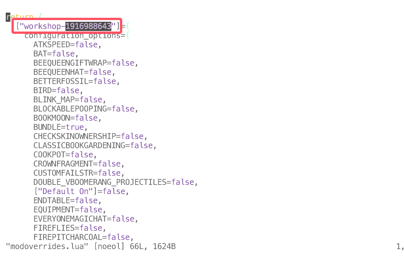 回到存档MyDediServer文件夹,进入Master文件夹,打开modoverrides.lua模组配置文件,其中有workshop-开头的代码,后面接的就是模组的ID