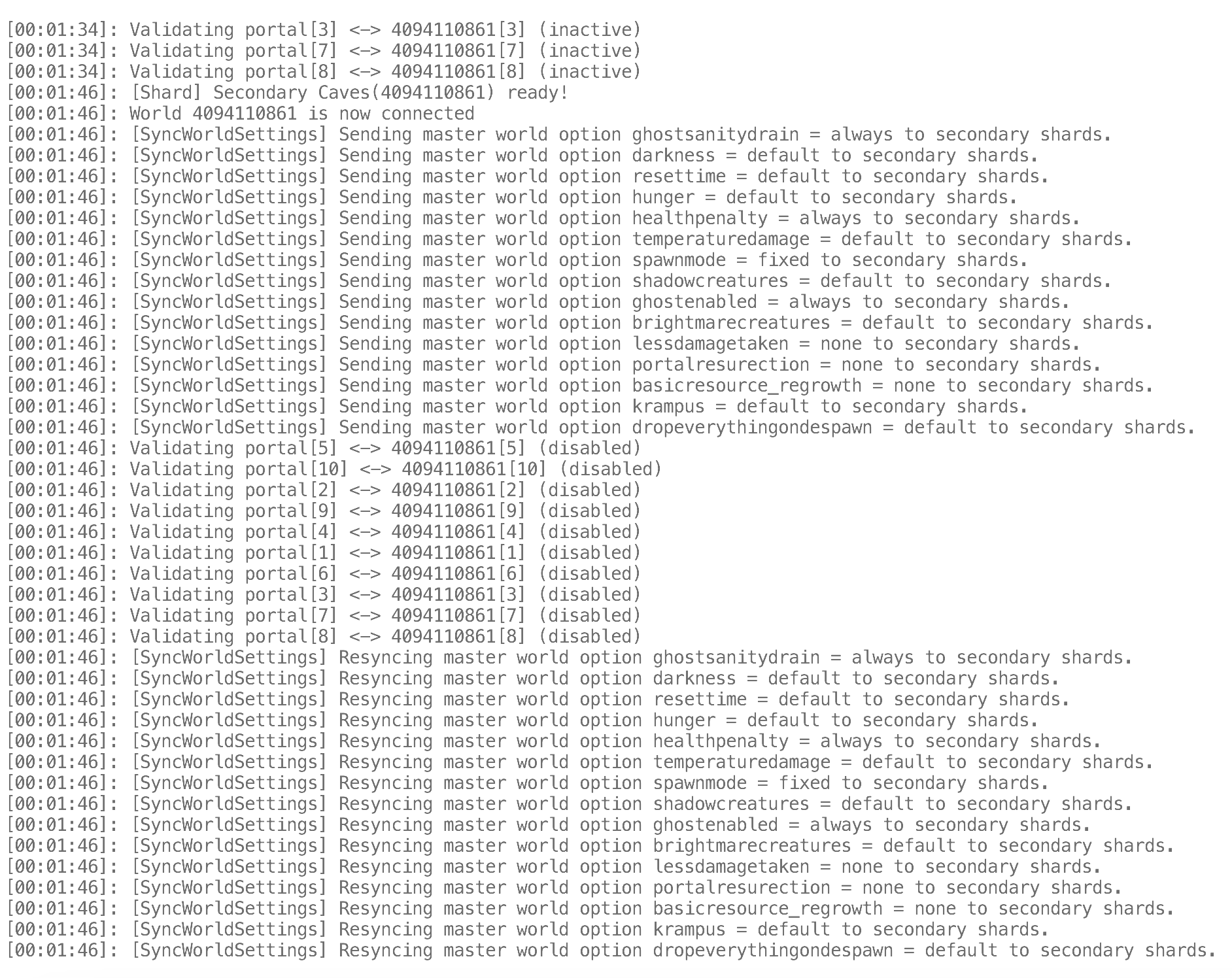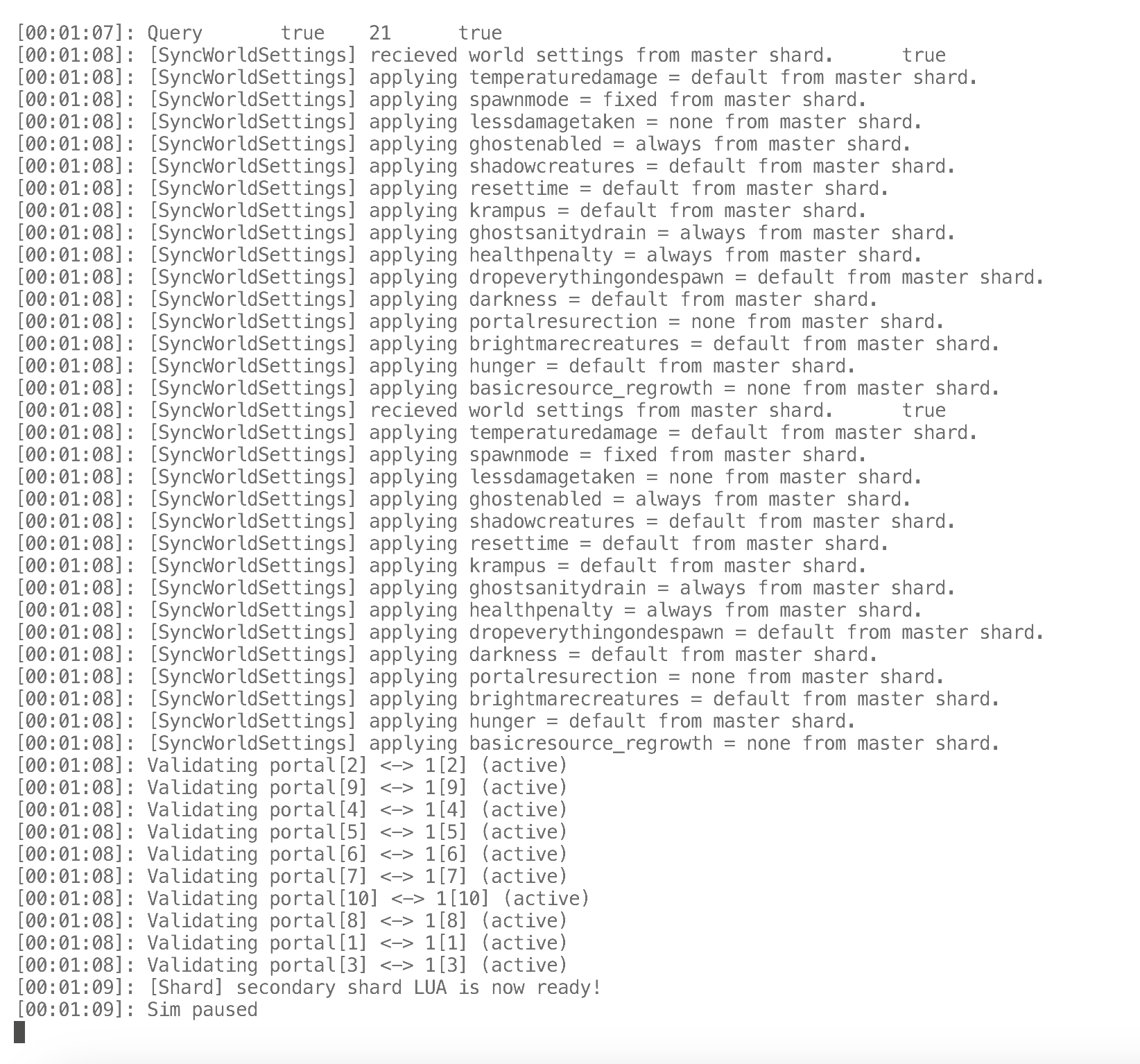 日志提示’[Shard] secondary shard LUA is now ready! Sim paused’则是服务器启动成功,世界已暂停。 现在就可以打开饥荒饥荒联机版,在多人游戏中搜索你的世界名称加入游玩了。